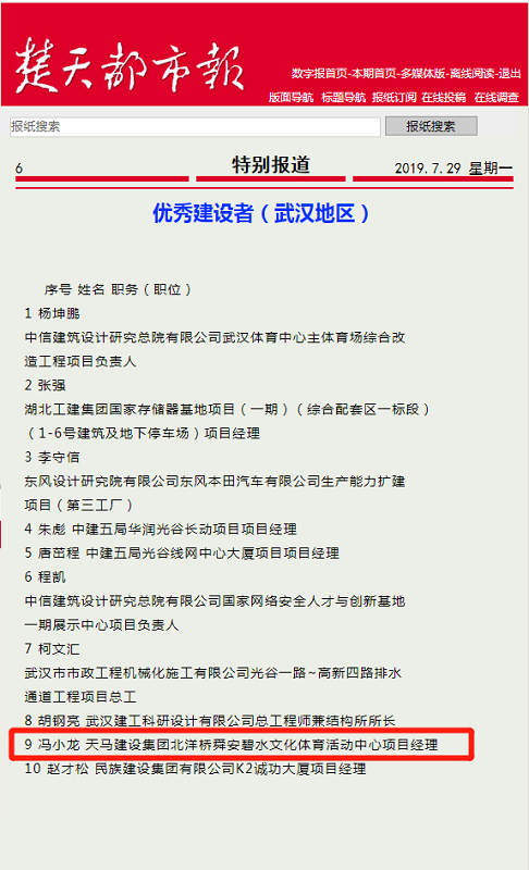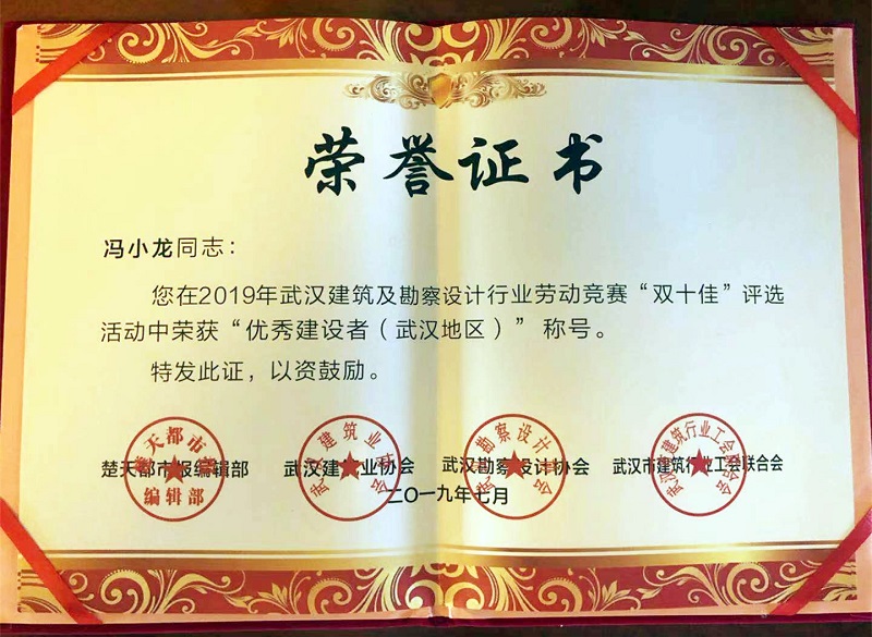 近日,由楚天都市報(bào)、武漢建筑業(yè)協(xié)會(huì)、武漢勘察設(shè)計(jì)協(xié)會(huì)、武漢市建筑行業(yè)工會(huì)聯(lián)合會(huì)聯(lián)合主辦,被譽(yù)為武漢城建行業(yè)“奧斯卡”的2019年武漢建筑及勘察設(shè)計(jì)行業(yè)勞動(dòng)競賽“雙十佳”評(píng)選頒獎(jiǎng)典禮,在楚天傳媒大廈隆重舉行。天馬建設(shè)集團(tuán)北洋橋舜安碧水文化體育活動(dòng)中心項(xiàng)目經(jīng)理馮小龍榮獲武漢建筑及勘察設(shè)計(jì)行業(yè)“優(yōu)秀建設(shè)者(武漢地區(qū))”榮譽(yù)稱號(hào)。